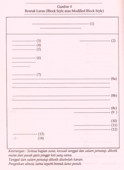 Bentuk surat lurus penuh (full block style ); Bentuk block style atau bentuk lurus penuh adalah salah satu bentuk surat yang umum digunakan oleh suatu instansi/perusahaan untuk menulis surat. Contoh bentuk surat lurus penuh (full block style). Contoh surat full block style bentuk surat ini disebut juga dengan surat bentuk lurus penuh. Bentuk setengah lurus (semi block style) merupakan bentuk surat dimana semua bagian surat, kecuali isi surat, diketika sama seperti bentuk lurus.